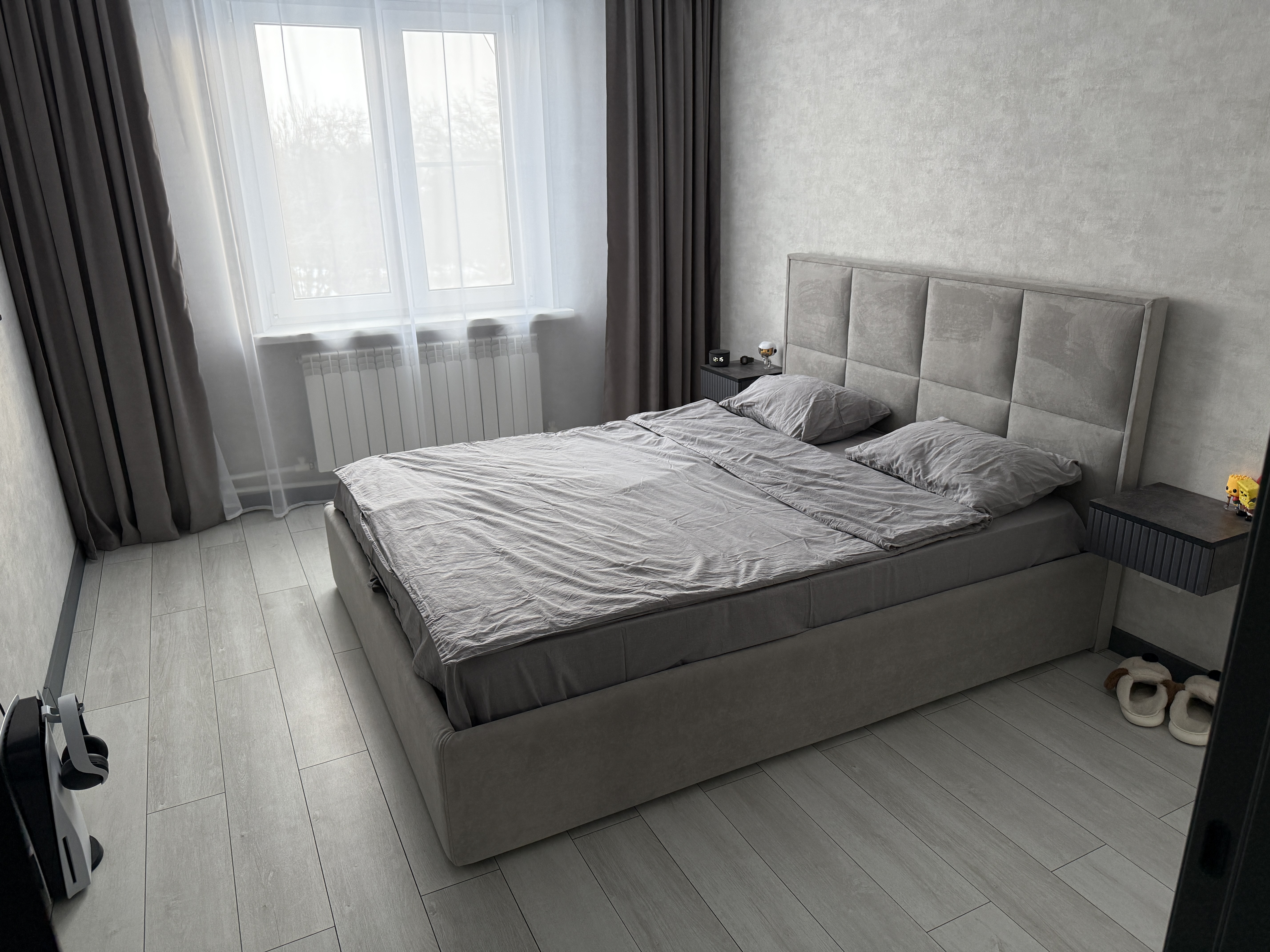 Низкие царги кровати создают ощущение расположения кровати на полу помещения, придают эффектную строгость.
