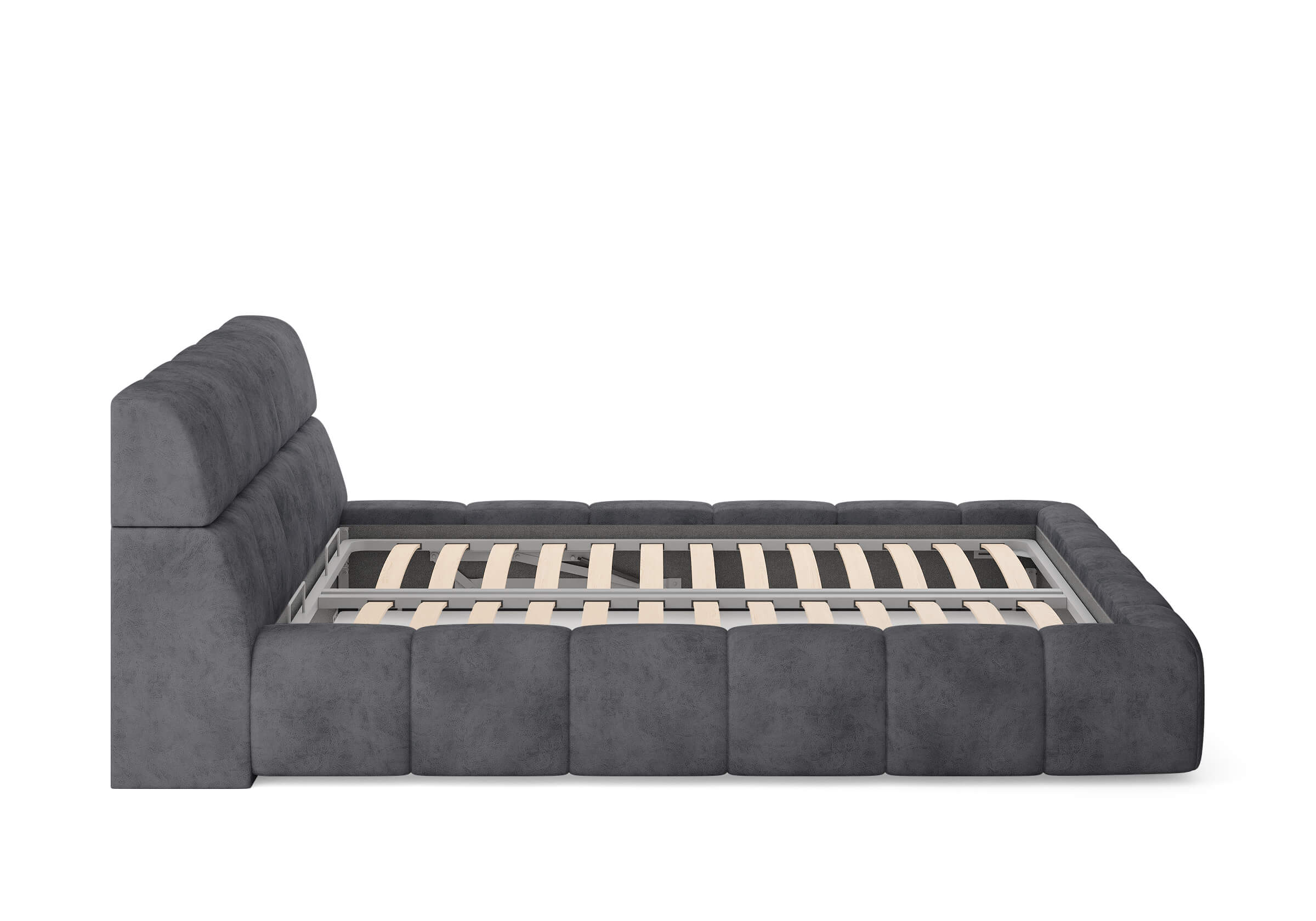 Изголовье выполнено в виде скруглённых квадратов. Модульное мягкое изголовье придают кровати дизайнерский вид.