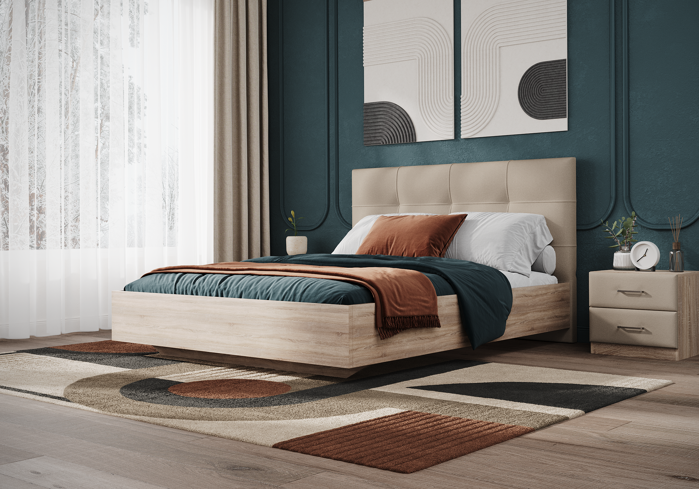 Царги из ЛДСП увеличенной толщины придадут строгость и надежность. Благодаря сочетанию усиленных металлических уголков, ребер жесткости и эксцентриковой стяжке конструктив кровати получается жёстким и прочным.